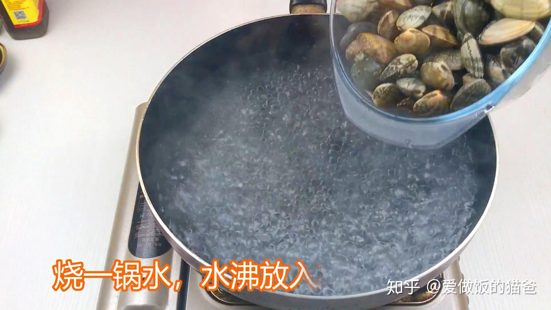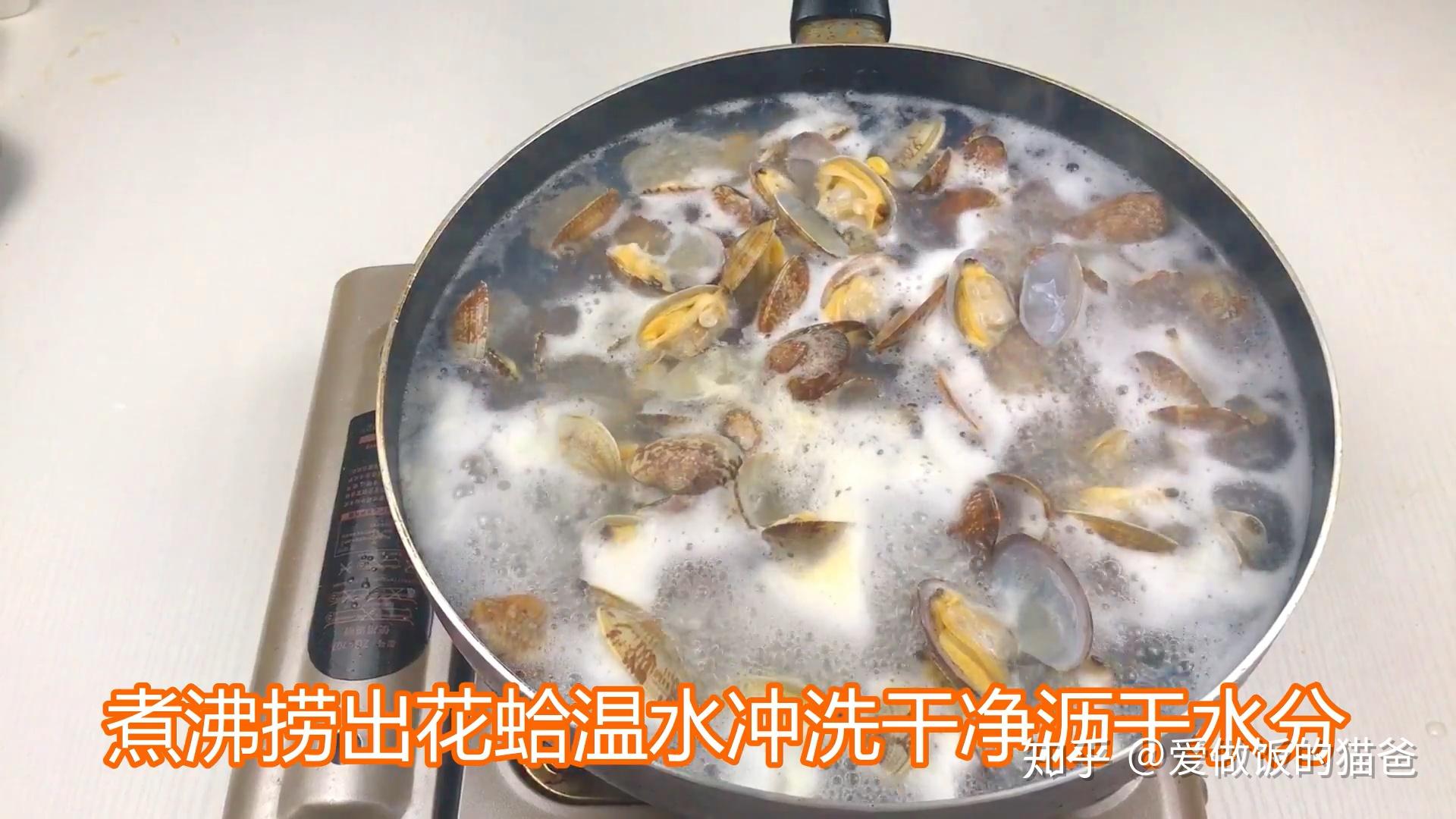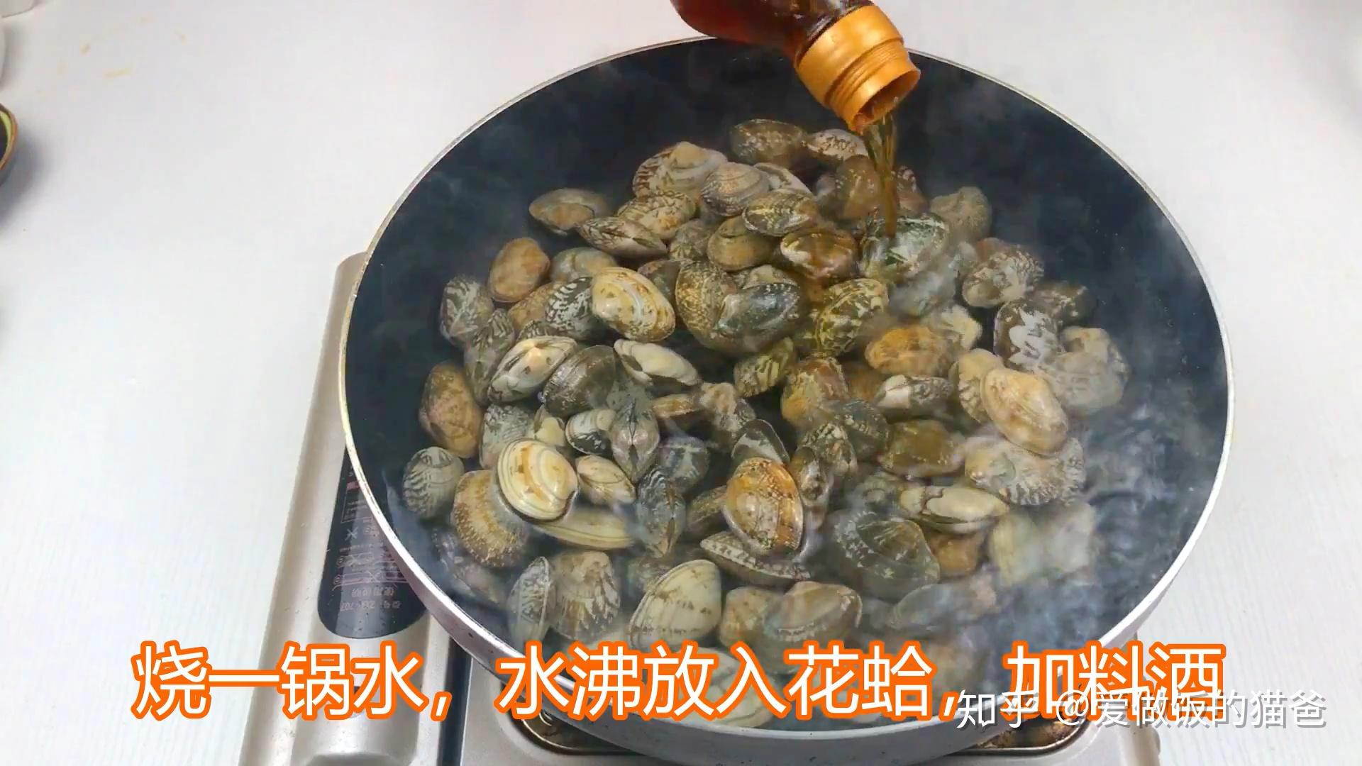 2.烧一锅水,水沸放入花蛤,加料酒焯水,煮沸捞出,别煮久了。花蛤温水冲洗干净沥干水分,别用凉水,一冷一热,花甲肉直接缩了