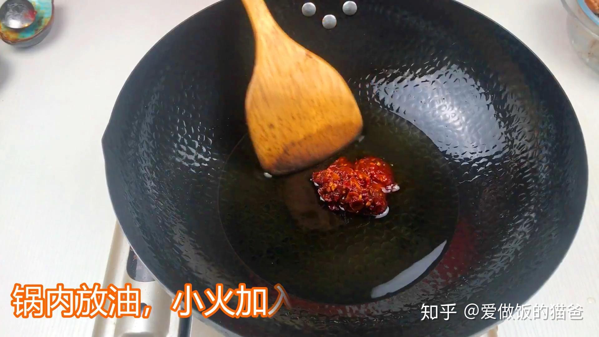 3.锅内放油,小火加入郫县豆瓣酱炒出红油,不要用大火,很容易焦