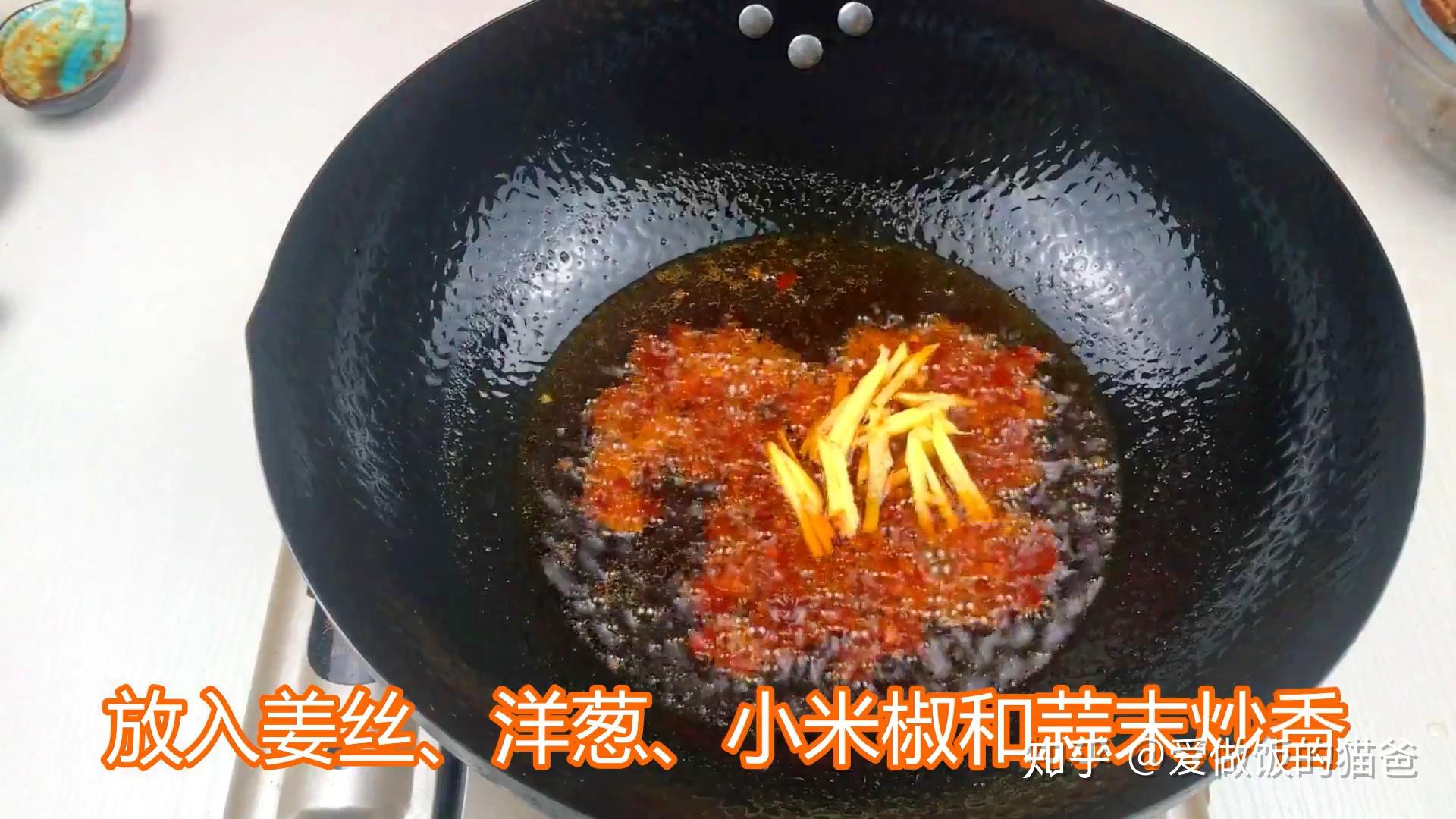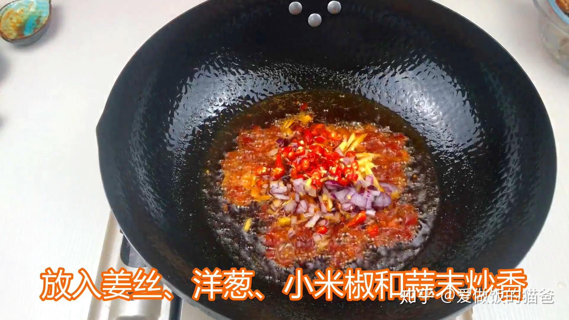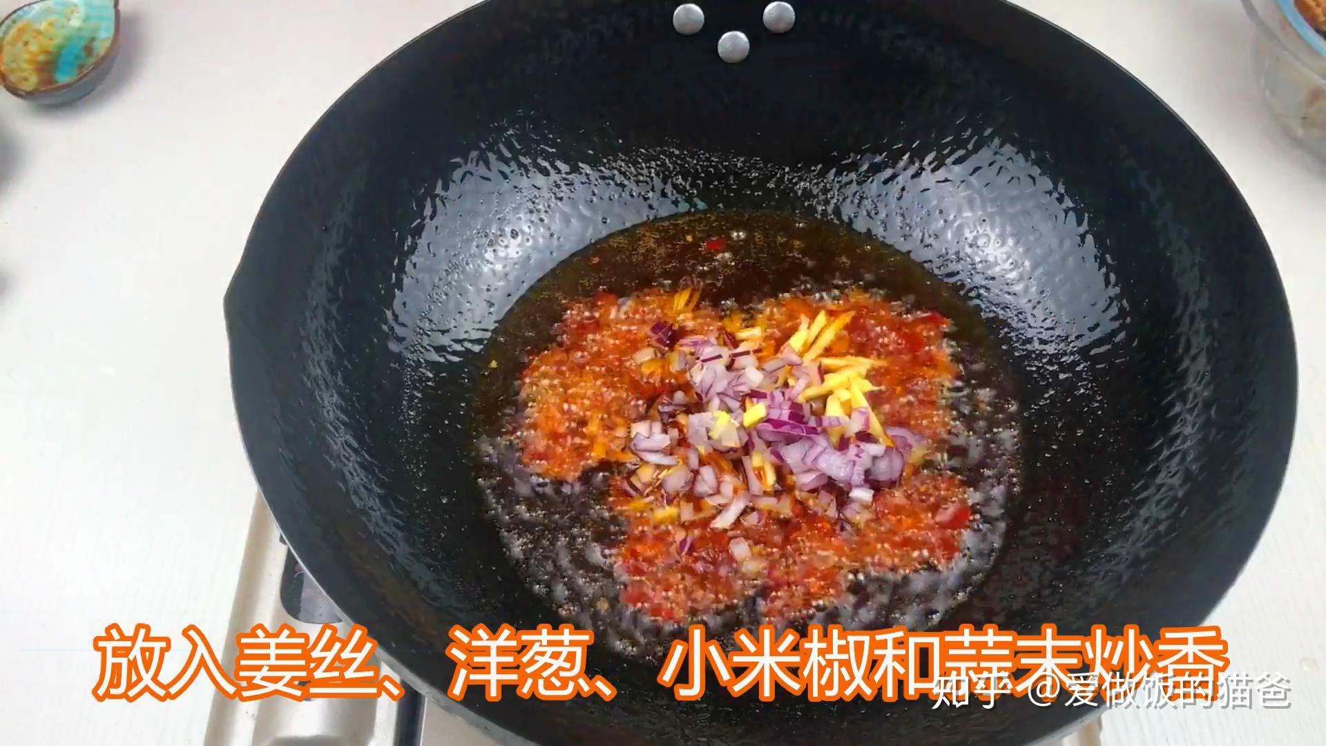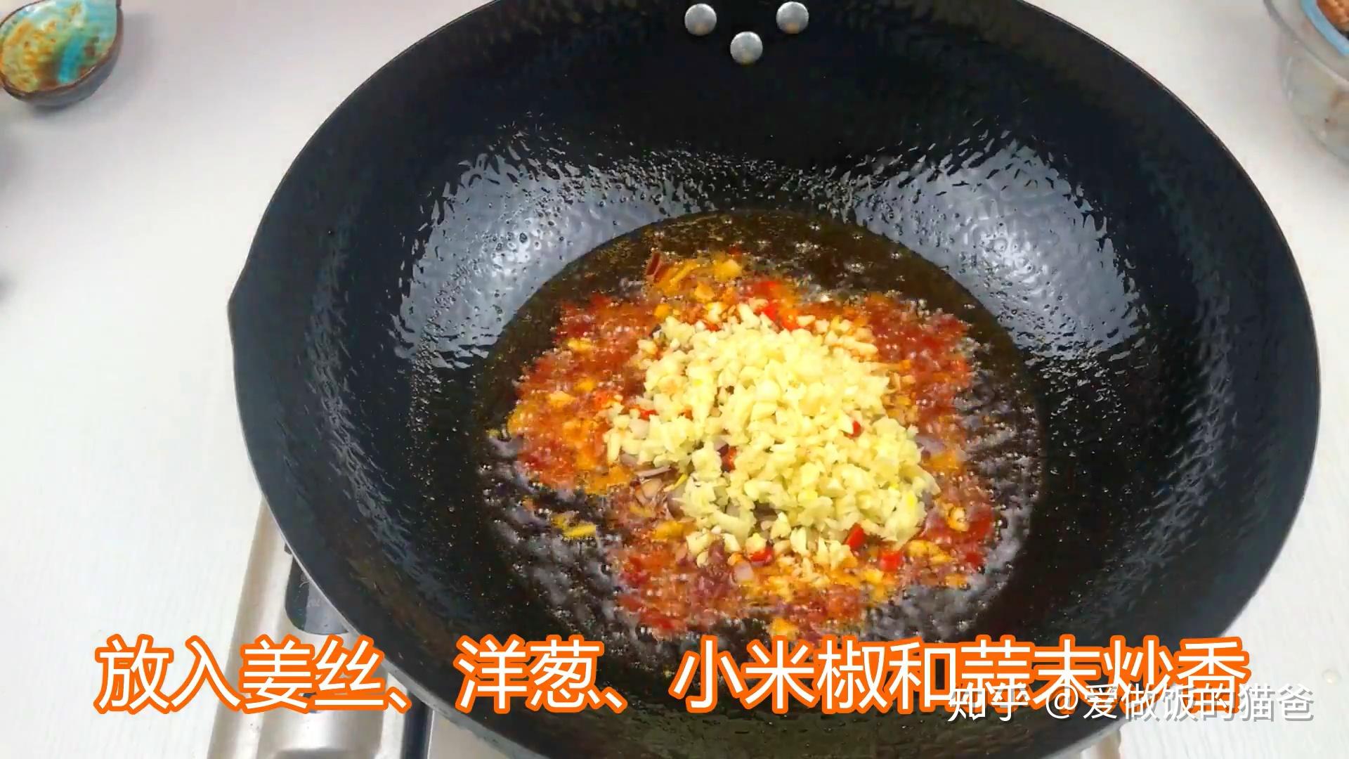 4.放入姜丝、洋葱、小米椒和蒜末,保持小火,炒香,不可大火,蒜末很容易焦