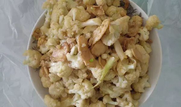 用料:鸡胸肉、菜花 调料:葱丝、姜末、大料、食用油、料酒、盐、鸡精、蚝油、粉芡