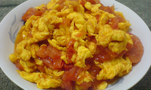2。 锅内放入适量(炒鸡蛋的时候,油放多少很关键,我的经验是放相当于鸡蛋液的2/3)的油,等油热了的时候,(我后面详细讲如何判断油的温度),倒入鸡蛋 液,注意这个时候,鸡蛋液会自然的凝固,不要动,等到这个鸡蛋液都凝固的时候(要小心油干了,造成鸡蛋糊了),用饭铲(也叫炒勺)从鸡蛋的边缘轻轻进入,将鸡蛋翻过来,煎一下,等两面的颜色都呈现金黄的颜色时候,把鸡蛋从锅里取出来(也可以不取,不过等熟练以后再说吧),这个时候锅里面应该还有一些油,把 西红柿翻进去,翻炒几下。由于西红柿里面含有大量的水分,会有水份析出,这个时候把炒好的鸡蛋放进去,放入少许盐,翻炒几下,出锅。