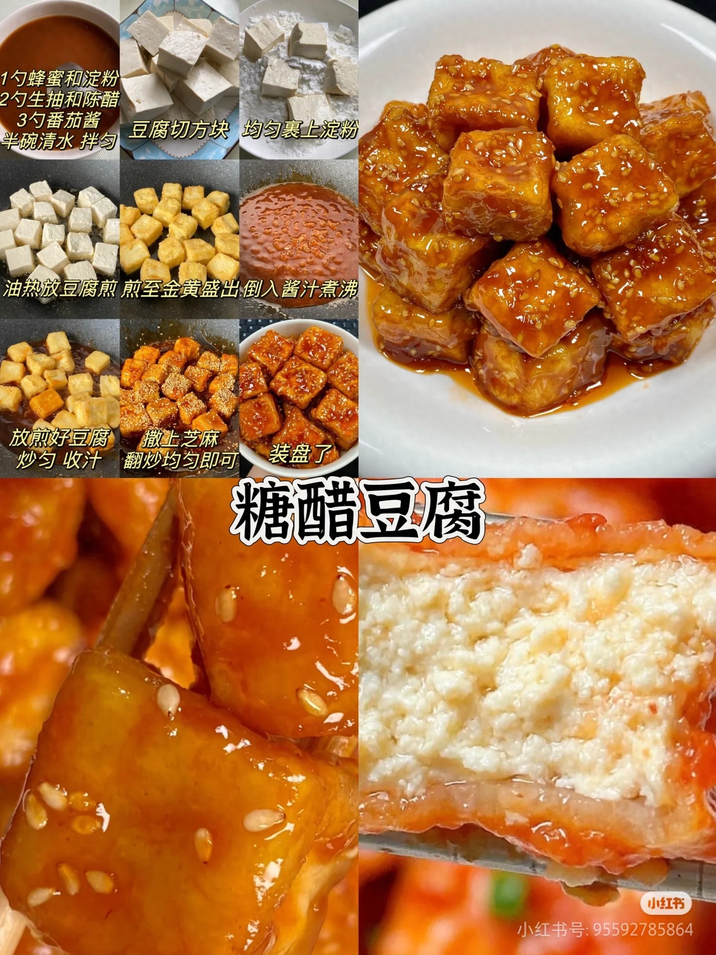 ✅做法:调汁(蜂蜜+淀粉+生抽+陈醋+番茄酱+清水)→豆腐切方块裹淀粉→煎至金黄→倒入料汁煮沸→放豆腐翻炒收汁→撒芝麻