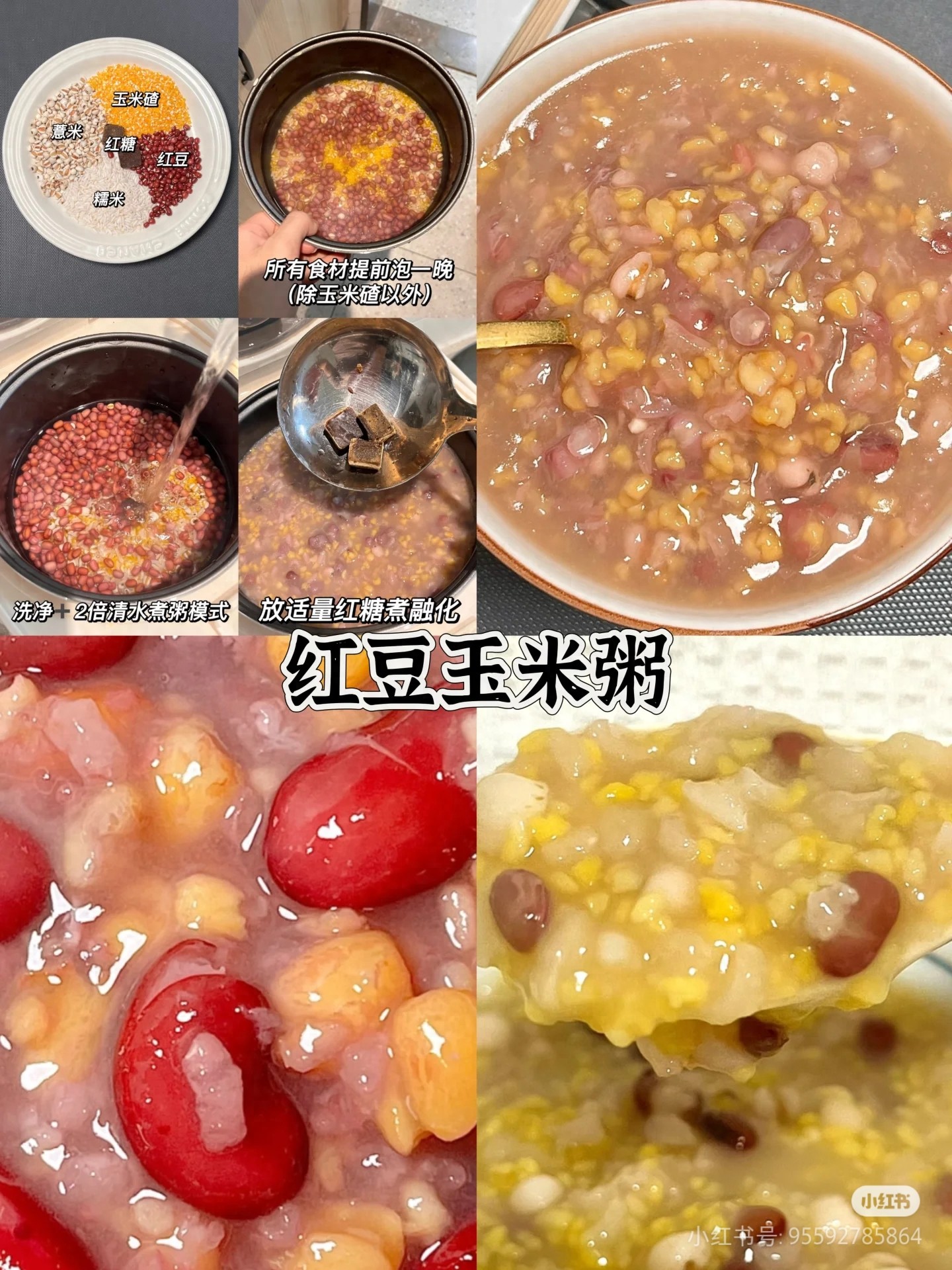 做法:除玉米碴外提前泡1晚→洗净加2倍水粥模式煮→放红糖煮化