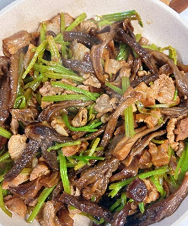 鹿茸菇炒肉倒是新尝试。以前只在店里吃过,后来发现干货泡发后比鲜菇更有嚼劲。泡过的鹿茸菇撕成细条,和瘦肉片一起炒,自带一种类似海鲜的鲜味,不用额外加味精。那天我爸吃了两碗饭,还问能不能下次多放点肉。