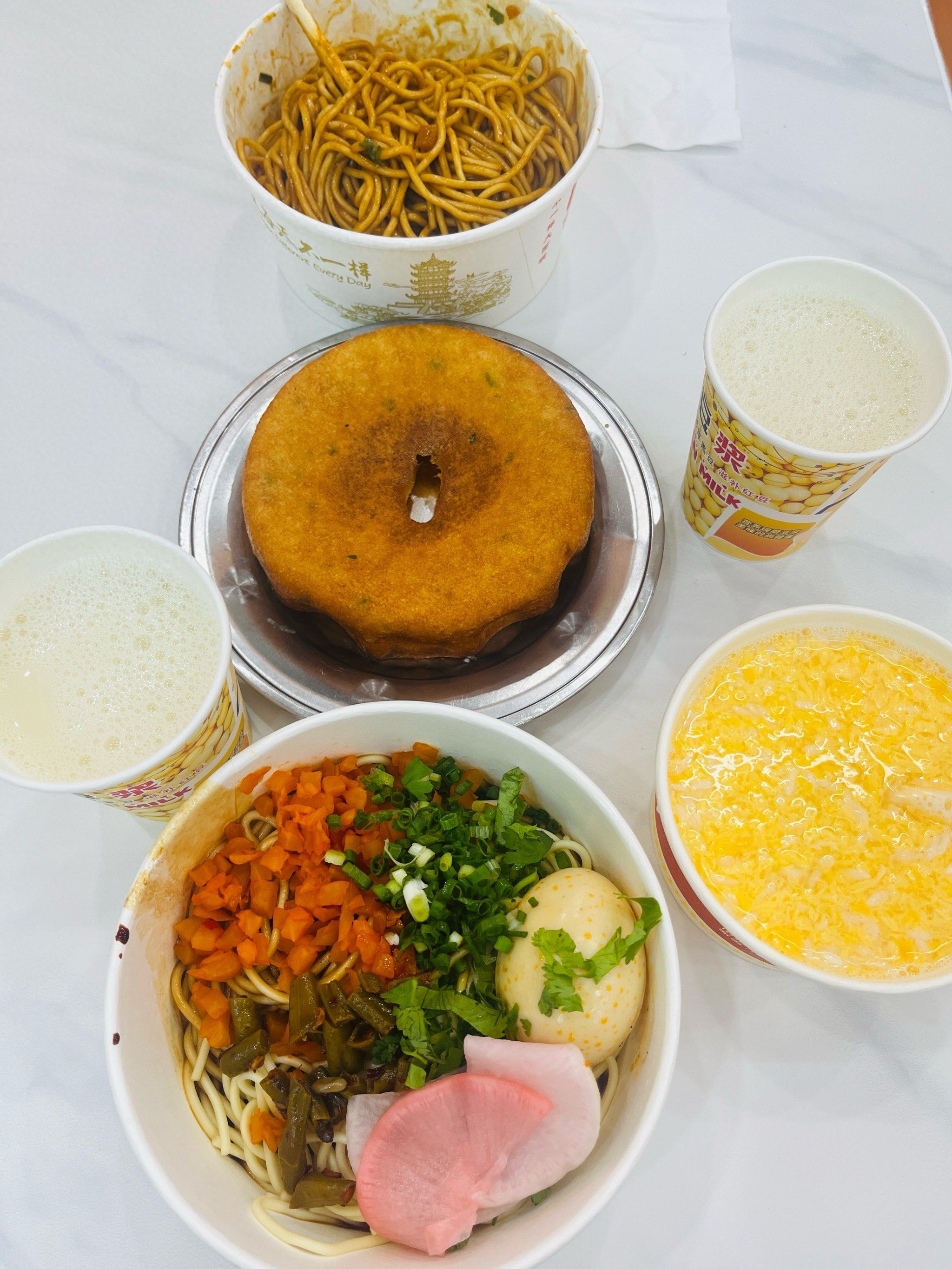 早餐的打开方式,是碳水星人的狂欢。天刚蒙蒙亮,街巷里的早点摊就升腾起热气,芝麻酱的醇厚、面窝的焦香、豆皮的油润,交织成唤醒武汉的烟火序曲。来一碗热干面是标配,碱水面筋道爽滑,裹上浓稠的黑芝麻酱,撒一把脆萝卜丁,拌匀后酱香直冲鼻腔,嗦上一口,咸香粘嘴,是刻在武汉人骨子里的味道。要是觉得不过瘾,再搭一个外脆内糯的面窝,咬开时米香混着芝麻香四溢;或者来一份三鲜豆皮,金黄蛋皮裹着饱满糯米,配上肉丁、香菇丁,煎得焦香四溢,一口下去,蛋香、米香、肉香层层迸发。捧着一碗热干面蹲在路边,边吃边和街坊唠嗑,这才是武汉早餐的正确姿势。