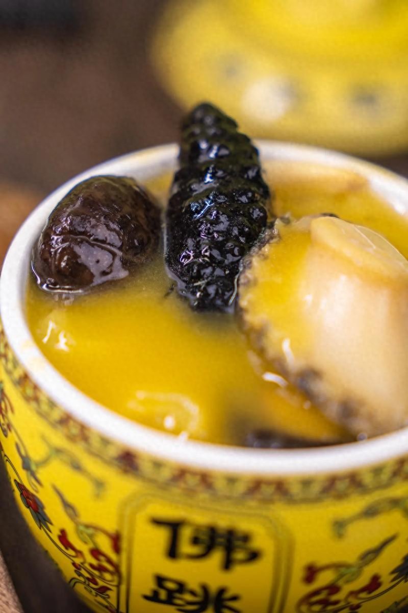 最先勾住魂的,当属佛跳墙。这道闽菜扛把子,光是听名字就自带传奇色彩。鲍鱼、海参、鱼翅、花胶、瑶柱……十几种山珍海味被请进酒坛,用荷叶封口,文火慢煨数小时。掀开坛盖的瞬间,浓郁的香气直冲天灵盖,醇厚的汤汁裹着每一寸食材,软糯的花胶黏而不腻,弹牙的鲍鱼吸饱了鲜味儿,连坛子里的萝卜都浸满了山海精华。难怪古时有僧人闻香破戒,换谁都抵不住这诱惑。