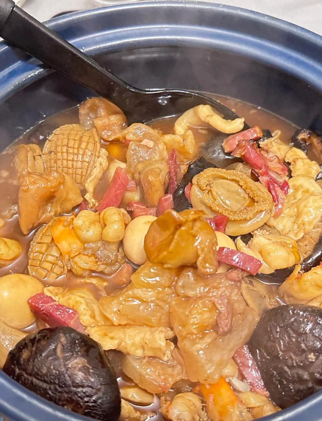 这些食材层层叠叠码入酒坛,密封后用文火慢煨数个时辰。时间是最好的调味师,让鲍鱼的鲜、海参的糯、菌菇的香、黄酒的醇,全都渗透到每一寸肌理里。掀开坛盖的那一刻,浓郁的香气铺天盖地而来,汤色金黄澄澈,舀一勺入口,软糯、弹牙、细腻、爽滑的口感在舌尖轮番上演,这才懂了何为“坛启荤香飘四邻,佛闻弃禅跳墙来”。