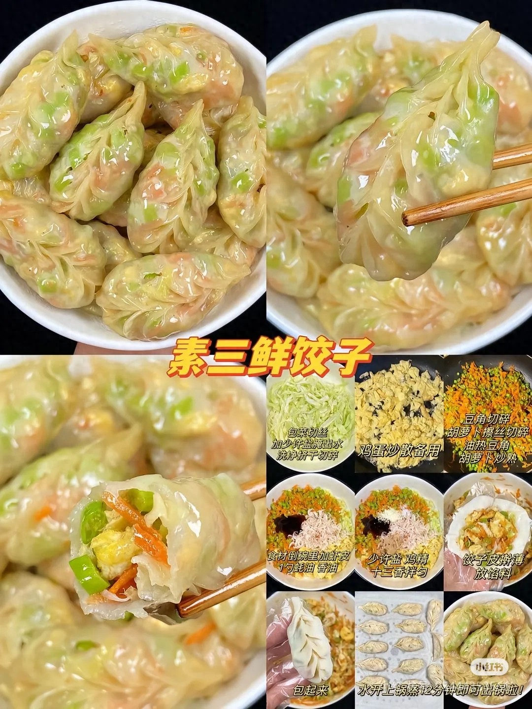 ✅ 素三鲜蒸饺:晶莹剔透的皮裹满鲜蔬,清爽不腻,素食党直接爱惨